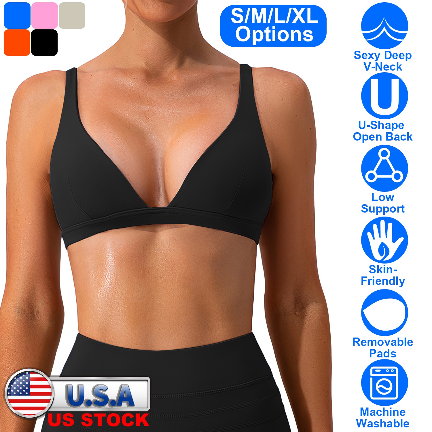 Home > Women Deep V-Neck Sports Bras U-Shaped Back Sport Bras Padded Strappy Crop Open Back Low Impact Bras Sexy Fitness Tank Tops with Removable Pads for Gy