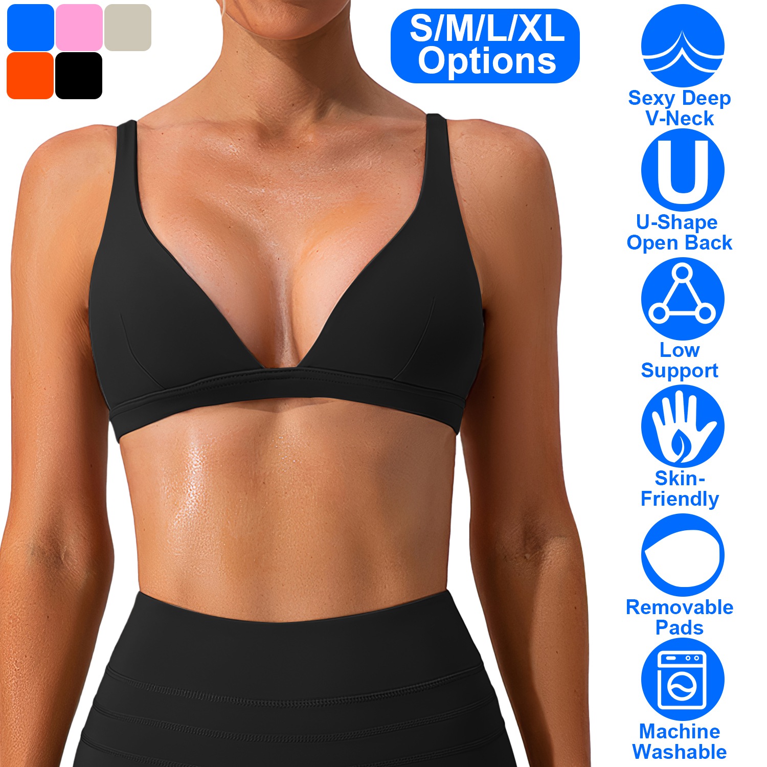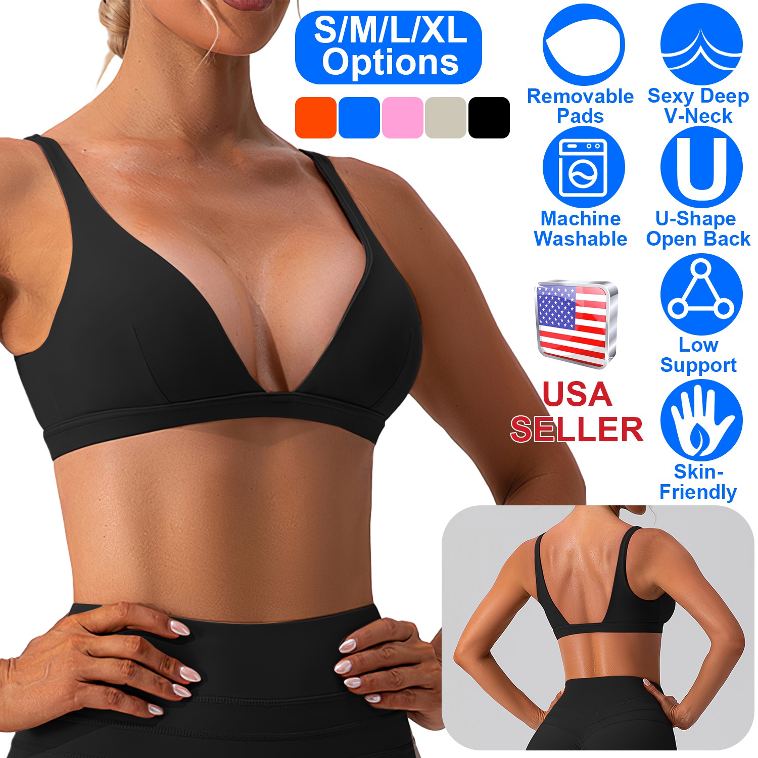 Home > Women Deep V-Neck Sports Bras U-Shaped Back Sport Bras Padded Strappy Crop Open Back Low Impact Bras Sexy Fitness Tank Tops with Removable Pads for Gy