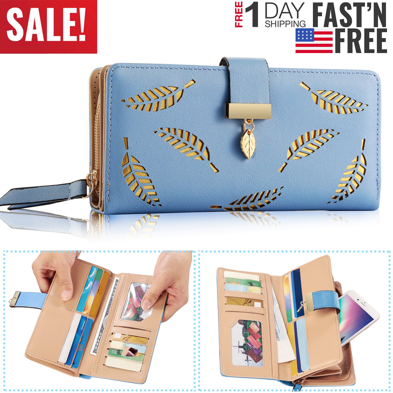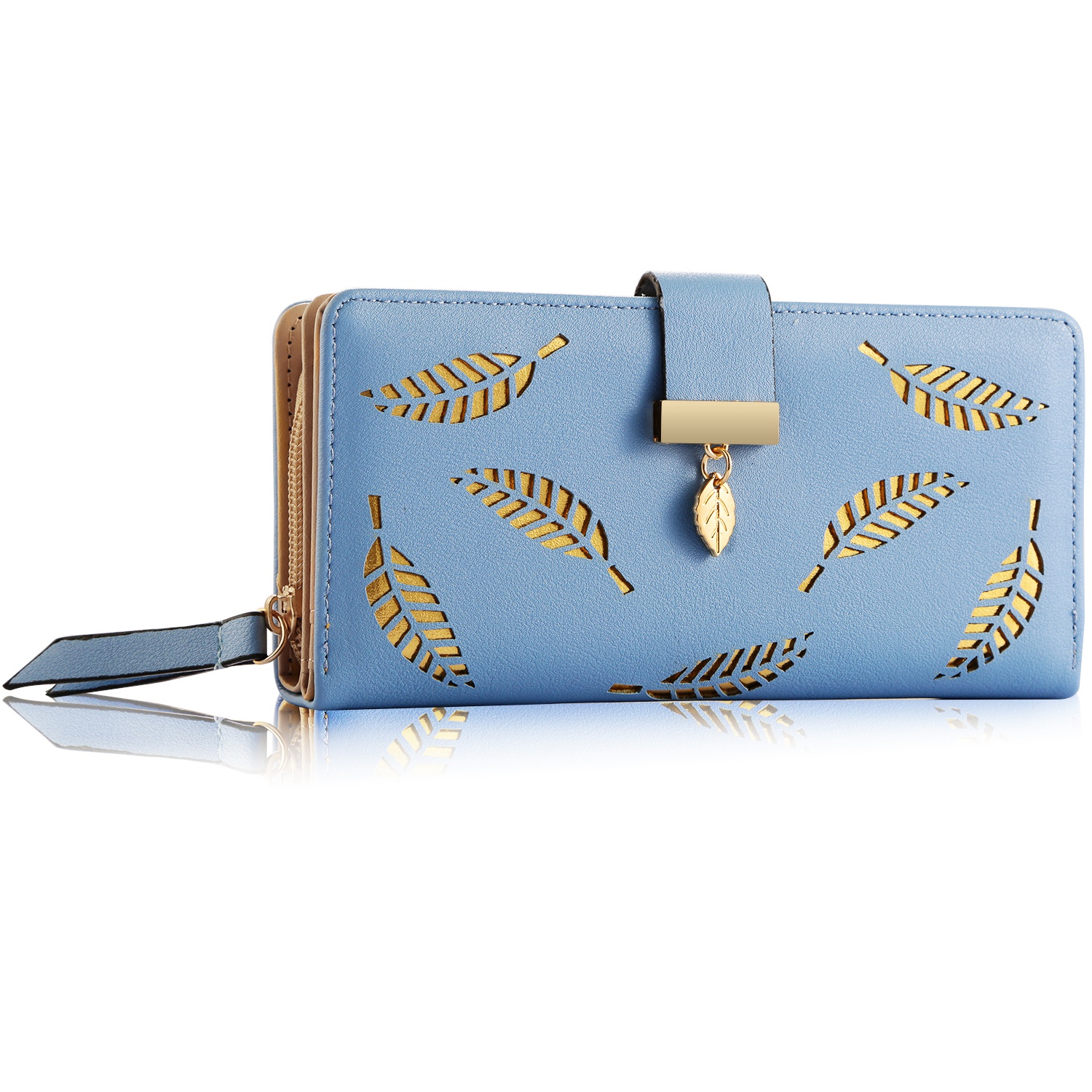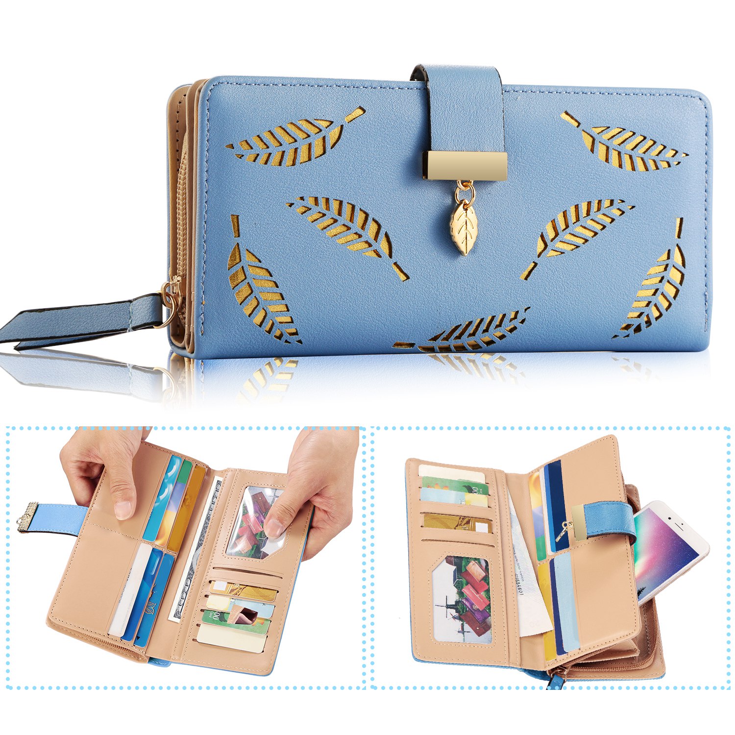 The clutch wallet adopts carefully selected top-quality PU leather and well-designed leaves cutout stylish appearance, which makes it match with ladies properly for daily use. Comes with 11 card slots, 1 ID window and full-length bill compartments to offer large capacity in an ultra-slim body. Available in colors of pink, black, khaki and blue, the clutch wallet is easy-matching to your different dressing. Snap closure and zippered closure design makes it easy access to your cards, cashes or phone, easy in and out.