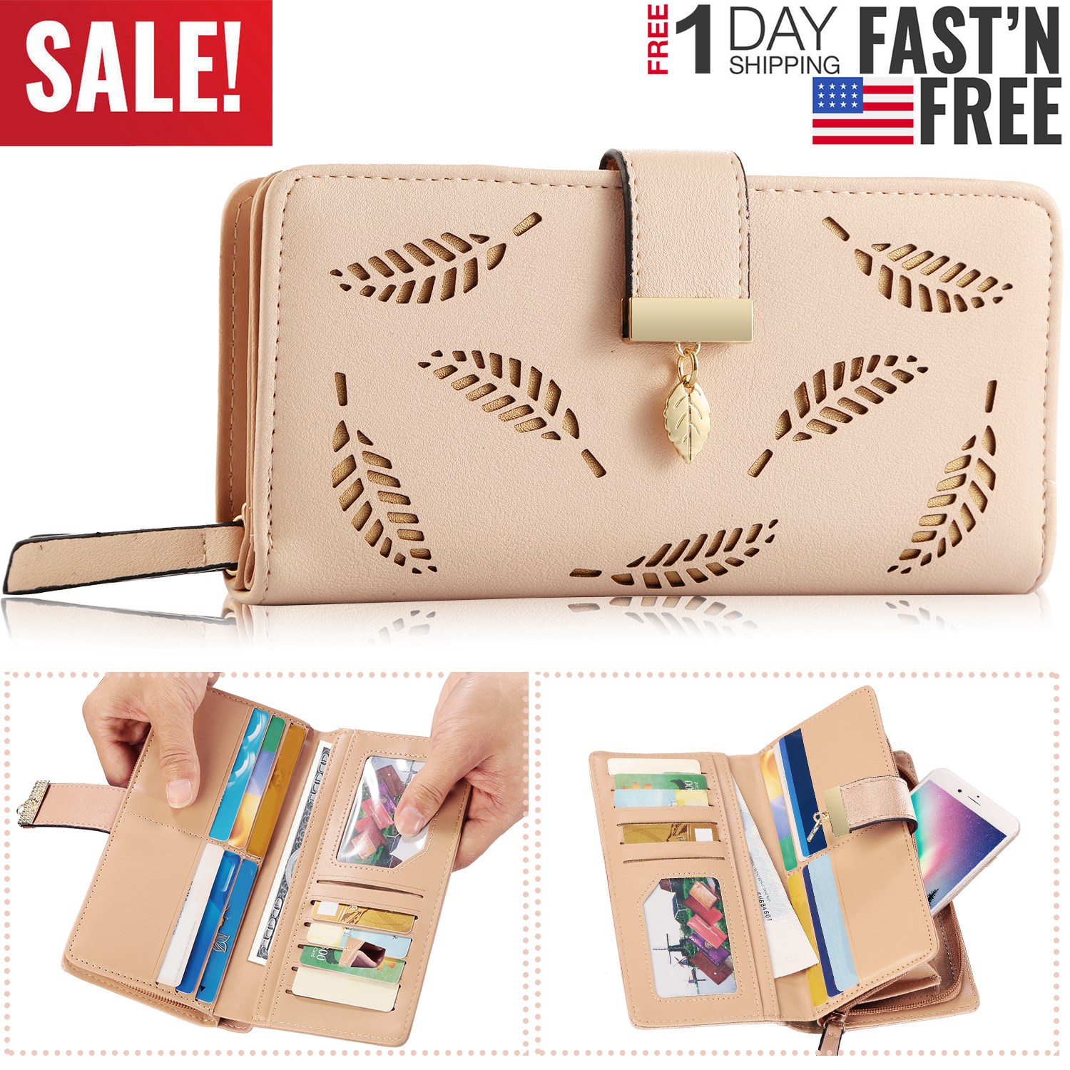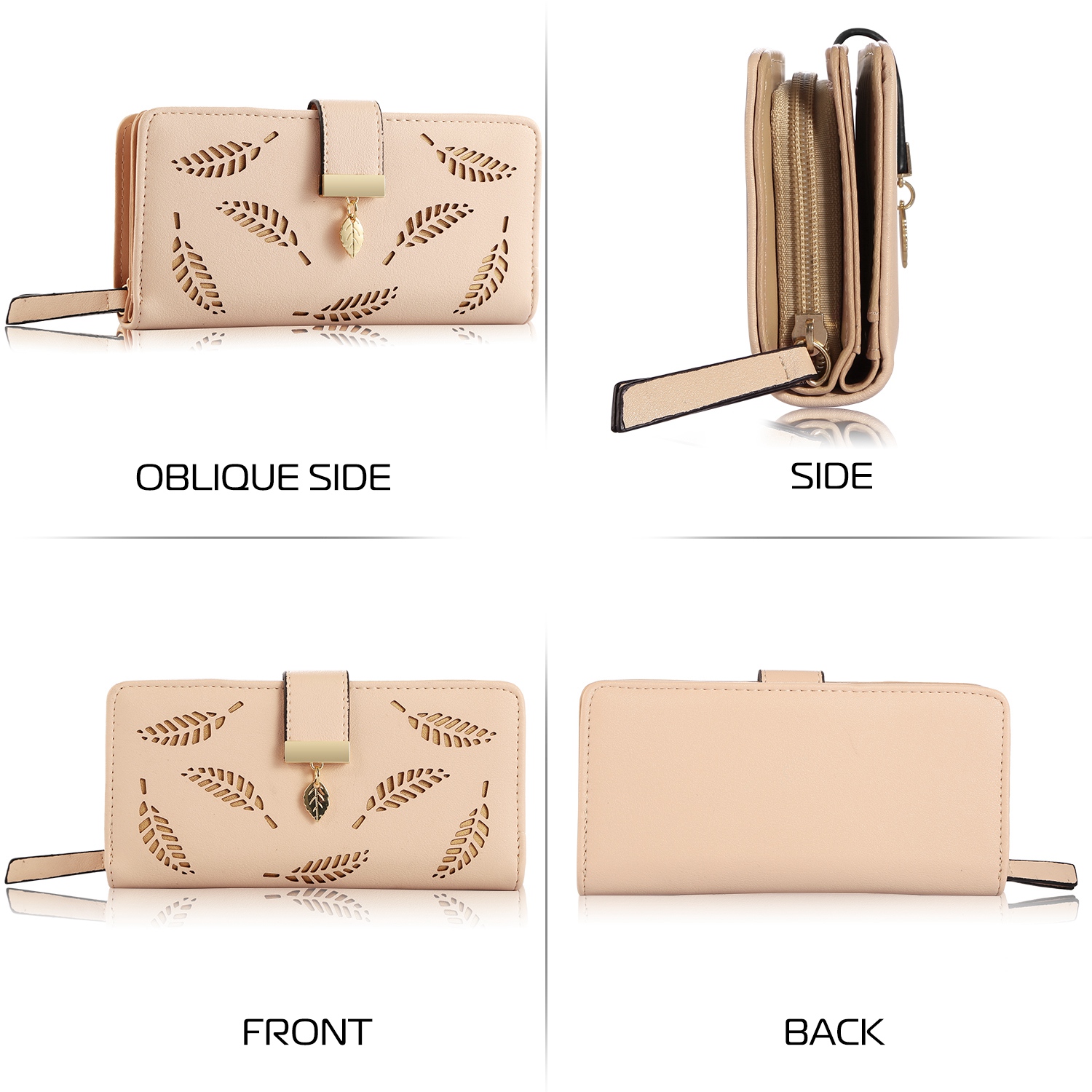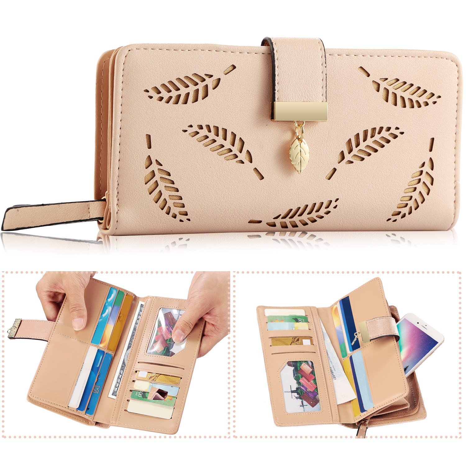 The clutch wallet adopts carefully selected top-quality PU leather and well-designed leaves cutout stylish appearance, which makes it match with ladies properly for daily use. Comes with 11 card slots, 1 ID window and full-length bill compartments to offer large capacity in an ultra-slim body. Available in colors of pink, black, khaki and blue, the clutch wallet is easy-matching to your different dressing. Snap closure and zippered closure design makes it easy access to your cards, cashes or phone, easy in and out.