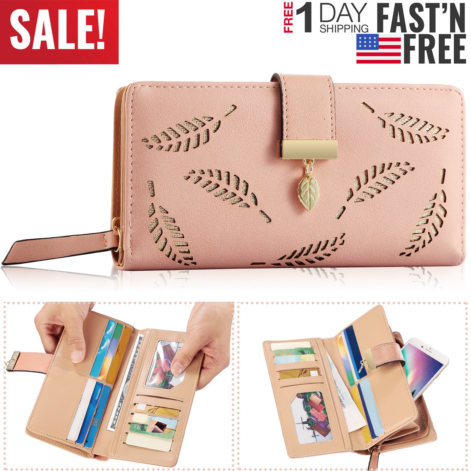 The clutch wallet adopts carefully selected top-quality PU leather and well-designed leaves cutout stylish appearance, which makes it match with ladies properly for daily use. Comes with 11 card slots, 1 ID window and full-length bill compartments to offer large capacity in an ultra-slim body. Available in colors of pink, black, khaki and blue, the clutch wallet is easy-matching to your different dressing. Snap closure and zippered closure design makes it easy access to your cards, cashes or phone, easy in and out.