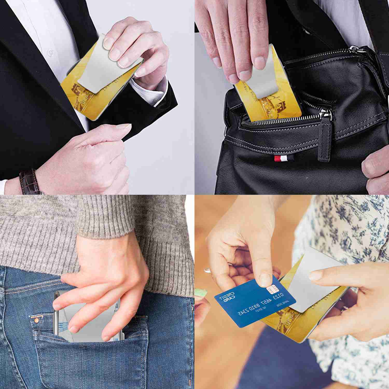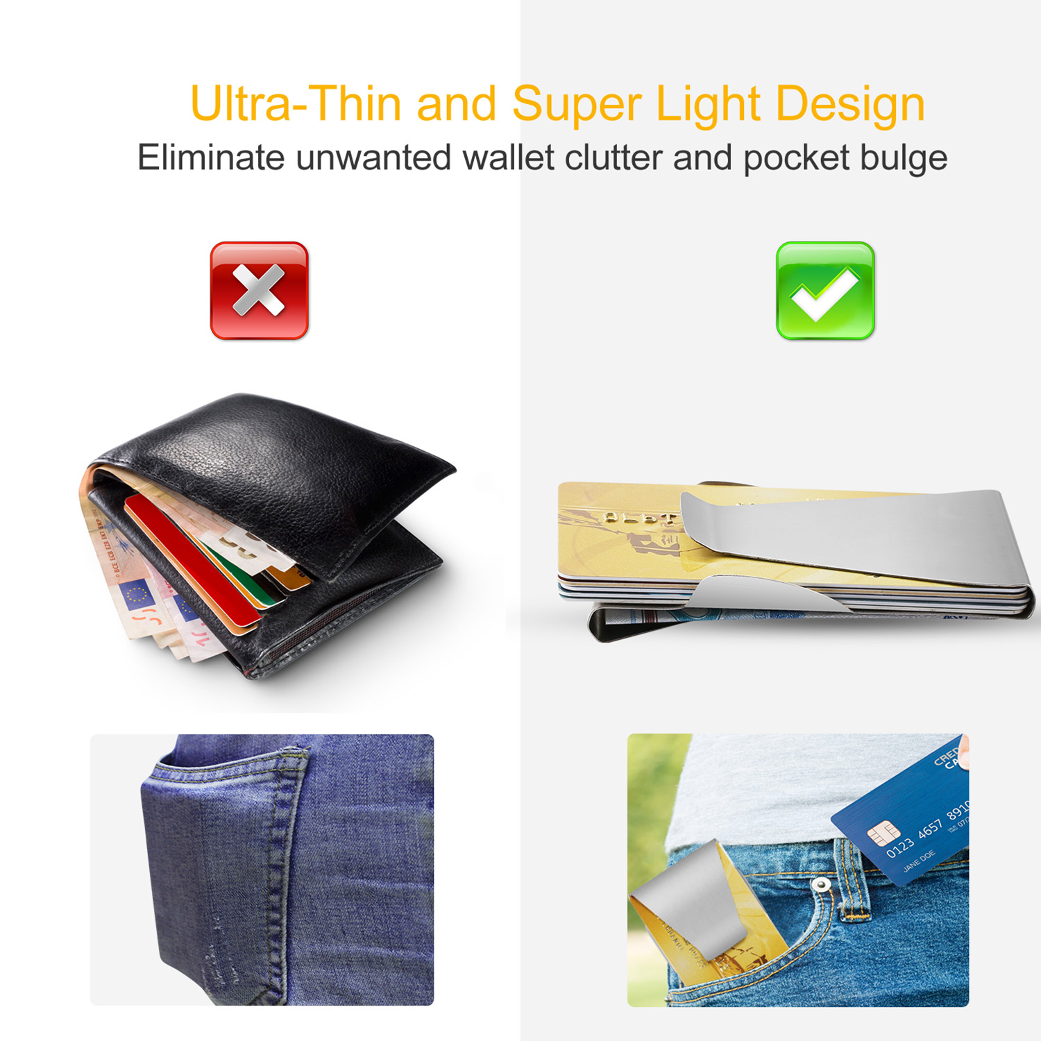 The slim clip features double sided clip, stainless steel and ultra-thin body, which can hold your credit cards and clip money simultaneously, perfect for business man. Its ultra-slim body but large capacity can hold up to 7 credit cards on one side and 15 cashes on the other side, a card layout manager which helps you eliminate unwanted wallet clutter and pocket bulge. Moreover, its palm-sized and lightweight (1.28oz) design makes it easy to carry for business trip, travel, etc.