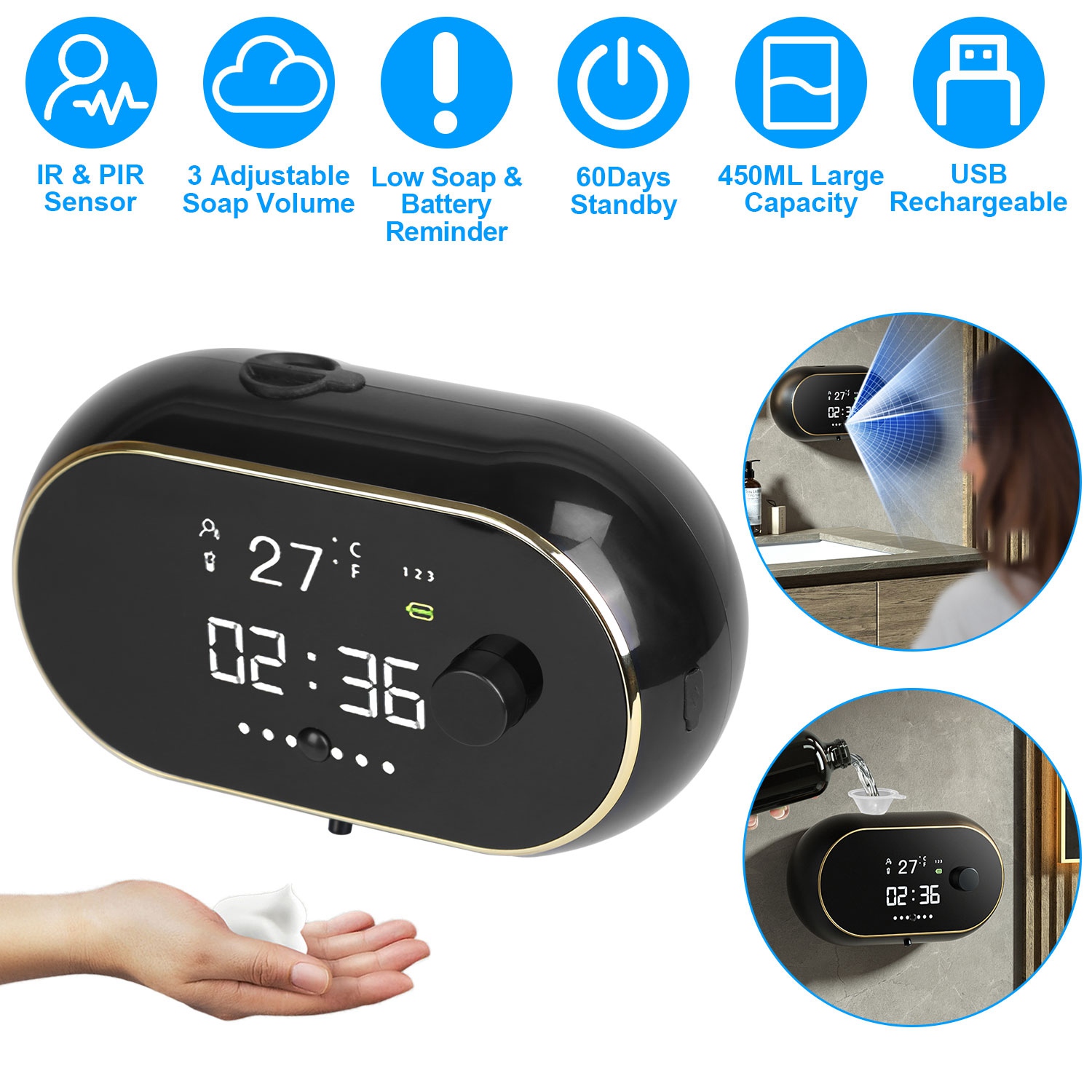 Home > Automatic Soap Dispenser Wall Mounted Hand Free Liquid Foam Dispenser Touchless Infrared Sensor Sanitizer 450Ml with Clock Temperature USB Rechargeabl